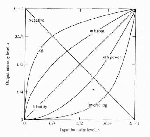 上图给出了几种常见灰度变换函数的曲线图,根据这几种常见函数的曲线形状,可以知道这几种变换的所能达到的效果。例如,对数变换和幂律变换都能实现图像灰度级的扩展/压缩,另外对数变换还有一个重要的性质,它能压缩图像灰度值变换较大的图像的动态范围(例如,傅立叶变换的频谱显示)。