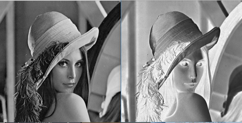 在进行图像增强时,上述的线性变换函数用的较多的就是图像反转了,根据上面的参数,图像反转的变换函数为:s=255?s。图像反转得到的是图像的负片,能够有效的增强在图像暗区域的白色或者灰色细节。其效果如下: