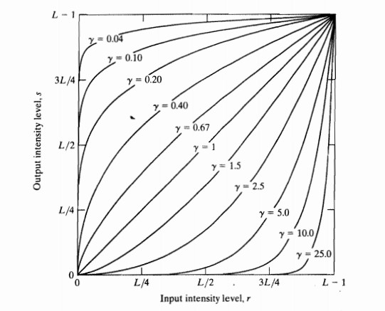 伽马变换的效果与对数变换有点类似,当时将较窄范围的低灰度值映射为较宽范围的灰度值,同时将较宽范围的高灰度值映射为较窄范围的灰度值;当时,情况相反,与反对数变换类似。其函数曲线如下: