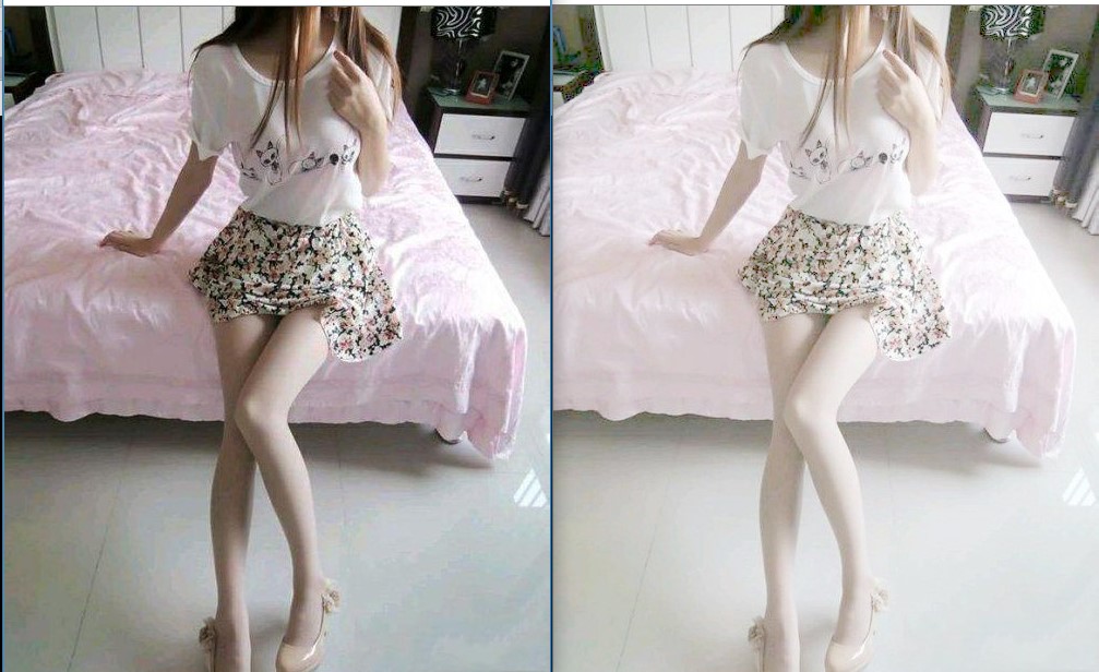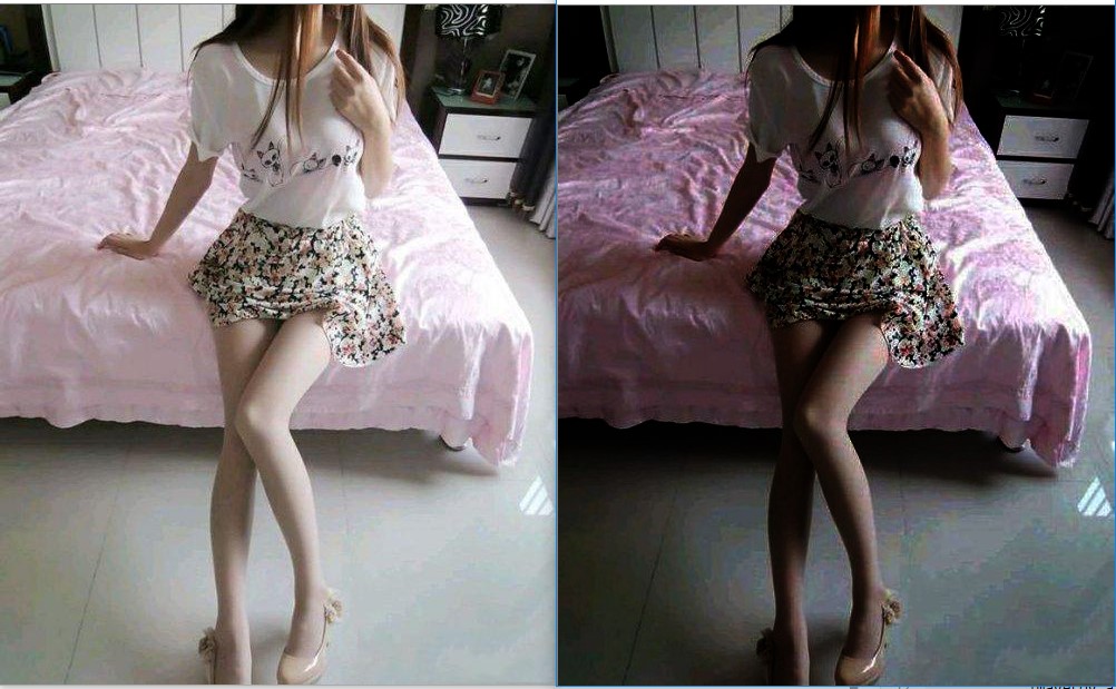 左边为原图像,其拍摄环境较暗,无法分辨出很多的细节;右边为变换后的图像,整个图像明亮许多,也能分辨出原图中处于暗区域的狗狗的更多细节。