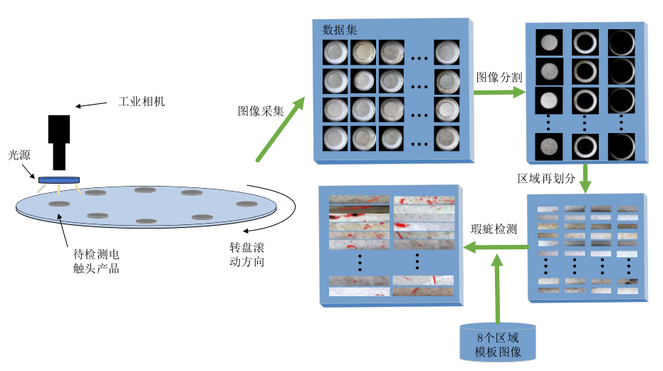 在实际生产环节中,待测产品往往处于转速较快的转盘之上,基于机器视觉的金属表面瑕疵识别系统需要快速可靠地依次对各个产品做出判别,并依据判别结果将产品划分为给定的类别。