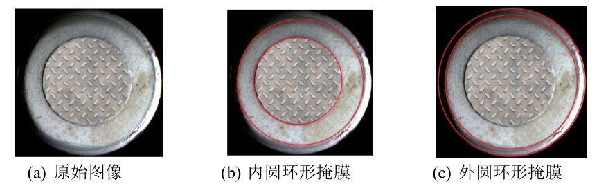金属产品在转盘上按一定方向转动,当其位于摄像头下方时进行图像采集,原始图像是由工业相机在平行光源下成像获得,采集的图像构成数据集。由于现场拍摄到的金属工件图像受打光不均、污渍灰尘、机械装置震动等因素的影响,拍摄到的原始图像往往背景不够单纯,含有各类干扰,导致图像特征提取困难。加之工业环境相对较为复杂,空气中的灰尘、细小纤维以及生产环节的残留的水汽,油渍等难免会进入到相机拍摄范围内,对瑕疵检测造成一定的干扰,因此有必要对采集到的图像进行预处理,以排除干扰将图像转换为更适合后续特征提取的形式。通过图像预处理也可以减少图像处理时间,提供更高的识别精度。