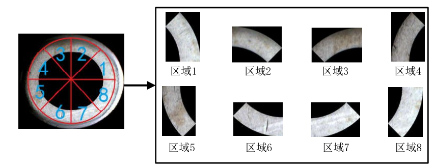 光照并非均匀照射到整个金属产品表面,但光照过渡较为平缓。为减弱光照不均的影响,便于后续特征提取环节,本次使用8个扇形掩膜将光滑区域和外圆区域平均分成8个区域,对应于编号1-8。