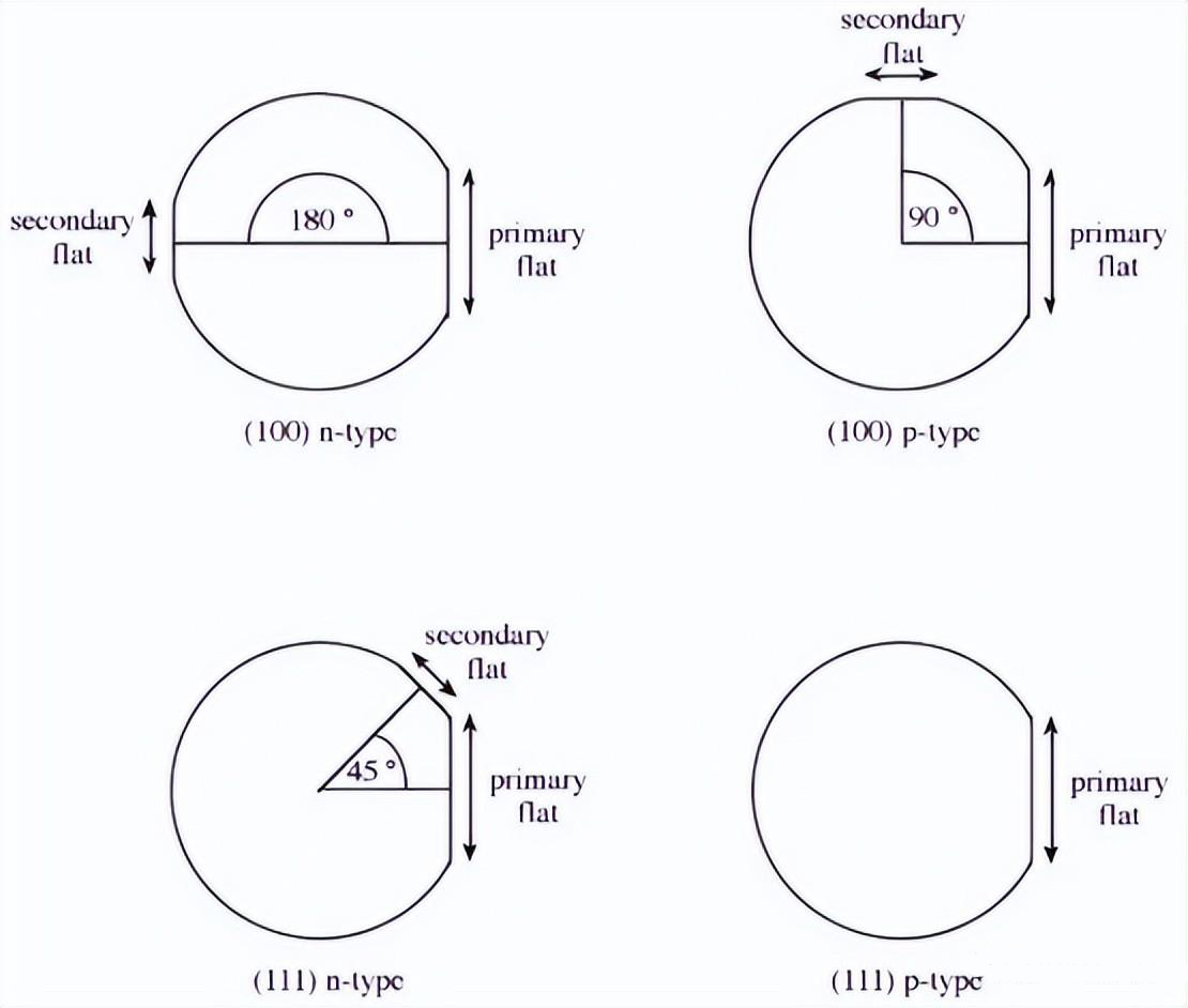 其次,还可用于识别Wafer基本信息的晶体方向和类型,晶圆上的切口数量及位置,代表了晶圆的“晶向”及“掺杂类型”。如,根据使用最广泛的SEMI标准,它通过初级和次级平面形成的角度来区分晶圆:
