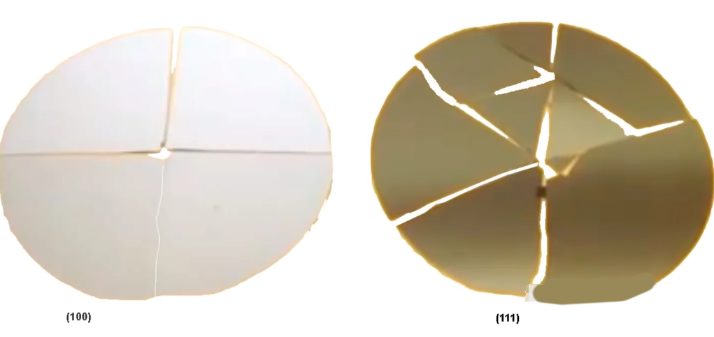 直观来看,不同晶向硅片在碎裂时,碎裂形态差异非常之大。