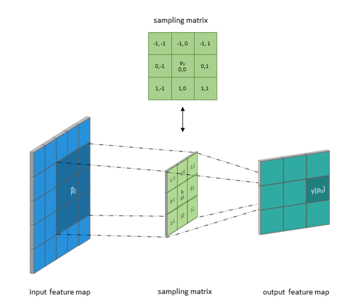 如上图3×3标准卷积和可变形卷积中采样矩阵地图示: