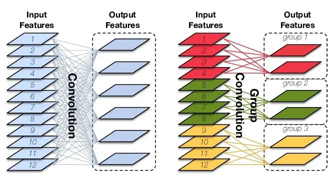 Group Convolution(分组卷积)就是对输入feature map在channel维度进行分组,然后每组分别卷积。