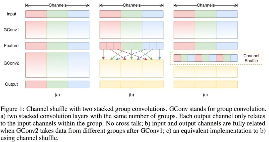 Shuffled GroupedConvolutions 是在 Groupconvolution 计算后对输出的 output feature maps 进行shuffle(打乱)处理,以使得接下来的Group convolutionfilters可在每个group所输出的部分channels构成的集合上进行计算。其操作如下图所示,这么做的原因是为了有效地减小Groups convolution使用导致的Groups间特征互不相通的负面影响。