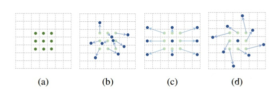 ·        b是变形卷积中偏移量增大(浅蓝色箭头)的变形采样位置(深蓝色点);