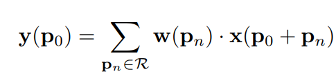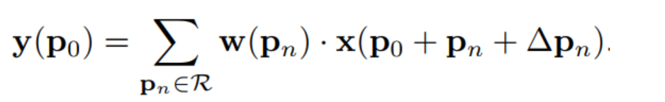 式中,Δp?表示加入正常卷积运算的偏移量。p?是枚举采样点。现在采样点位于不规则的偏移位置p?+?p?,即核的采样位置重新分布,不再是规则矩形,允许采样点扩散成非gird形状。