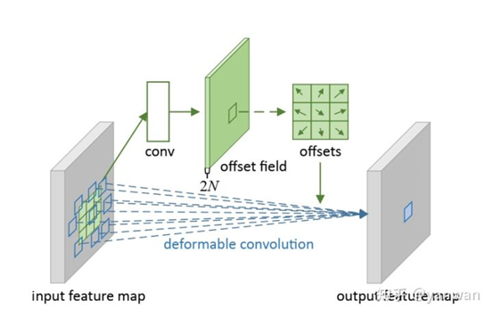 如下所示,偏移量通过在输入特征映射上应用卷积层来获得。假设原来的卷积操作是3*3的,那么为了学习offsets,需要定义另外一个3*3的卷积层,输出的offset field其实就是原来feature map大小,channel数等于2N(分别表示x,y方向的偏移,这里的N实际上是 kernel 里的 samplinglocation数。如果 3 x 3 的 kernel 的话,N = 9)。这样的话,有了输入的feature map,有了和feature map一样大小的offset field,我们就可以进行deformable卷积运算。所有的参数都可以通过反向传播学习得到。