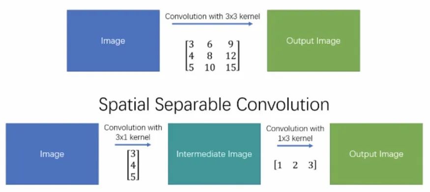 通过这种方式,原本一次卷积要算9次乘法,现在只需要6次。但是SpatiallySeparableConvolutions 有一个缺陷那就是并不是所有卷积核可以分成两个小的卷积核。