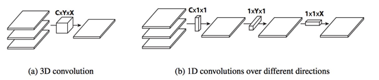 Flattened Convolutions是将三维卷积核拆分成3个1维卷积核。Flattened Convolutions 计算过程如图(b)。