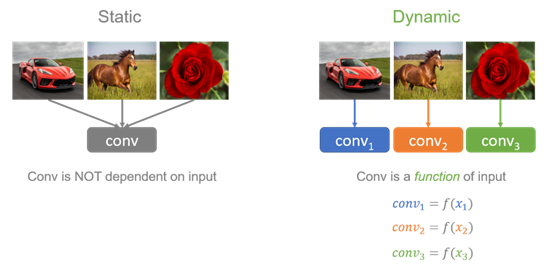 Dynamic Convolution是微软AI在CVPR2020提出的高性能涨点的动态卷积。动态卷积这种新的设计能够在不增加网络深度或宽度的情况下增加模型的表达能力(representation capacity)。动态卷积的基本思路就是根据输入图像,自适应地调整卷积参数。如图1所示,静态卷积用同一个卷积核对所有的输入图像做相同的操作,而动态卷积会对不同的图像(如汽车、马、花)做出调整,用更适合的卷积参数进行处理。简单地来说,卷积核是输入的函数。