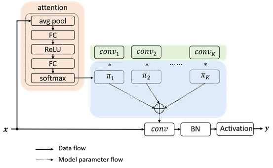 动态卷积没有在每层上使用单个卷积核,而是根据注意力动态地聚合多个并行卷积核。注意力会根据输入动态地调整每个卷积核的权重,从而生成自适应的动态卷积。由于注意力是输入的函数,动态卷积不再是一个线性函数。通过注意力以非线性方式叠加卷积核具有更强的表示能力。