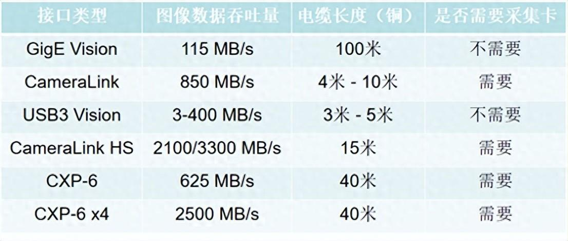 不论是在传统的基于PC的机器视觉系统中,还是在日益重要的嵌入式视觉系统中,相机数据接口的选择都是至关重要的考虑因素。越来越高分辨率的CMOS图像传感器和越来越高的检查速度,要求在相机和处理器之间传输大量数据,这对应用所需的带宽和图像数据传输距离提出了更高的要求。许多数据传输硬件已专门为机器视觉领域开发了许多种接口,包括CameralLink,GigE Vision,USB3 Vision,CoaXPress和CameraLink HS。(如图所示)。