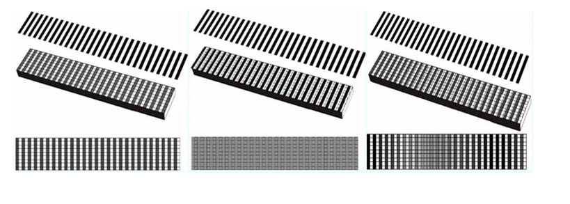 正由於 CCD 分布是如此的规律,所以你可以了解如果是拍摄一组同样条理分明的密集线条,例如:上图中的黑白相间的Bars,如果 Bars 的密度低於 CCD 间格的密度,当然拍出的影像是『条条皆清楚』(左图);反过来说,如果 Bar 的密度远高於 CCD 的间格,那么数位相机就会将其换算成一整片的『灰』色(图中)。可是如果 Bar 的密度恰好介於CCD可以分辨的间格之中(理论差值约为 1/2 Pixel / 图右),那么无可避免的数位相机还是会解读出部分可以辨识的结果,却也会加上不能辨识的灰阶地带,两者的和就会形成规律性的纹路,而反应在视觉上就是周期性的波纹。