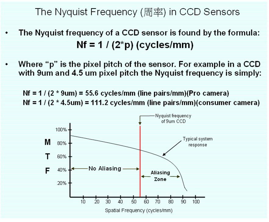 由於摩尔纹可以说是只有数位相机才有特有瑕疵,因此有必要彻底了解摩尔纹产生的原因。为何摩尔纹会出现在数位影像,却不会出现在底片上,就必须先从认识底片与CCD基本构造不同开始。简单的说,由於底片上密布了乱数分布之均匀感光粒子,因此可以将其视为一个完整的感光平面;CCD和CMOS 则全然不同、那是一个完整地、排列整齐的电子感光原件『矩阵』。同学也可以这样想像,你无法确定每一张底片上究竟有多少感光粒子,可能有一千万、也可以是一千一百万,大体是维持在这样的平均数之中;但对於CCD来说,标准的三百万画素就是 2048X1536 个『Pixel』,你每一次按下快门拍照,绝不可能多一个或少一个画素。