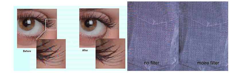 摩尔纹可以消除吗?答案是肯定,最简单的方法就是使数位相机的解像力小於感光物件的空间频率,使其成为『灰阶』化即可。这个方法可以透过『软体』与『硬体』两种方法做到。『软体』的部分主要是利用影像後制为主;硬体的部分,则可以使用镜前滤光镜(见下图左)专门消除 Moire effects,这种滤镜共有四个等级 4.0、5.6、8.0 与 11.0 级数越高者,可以呈现出更锐利的影像。