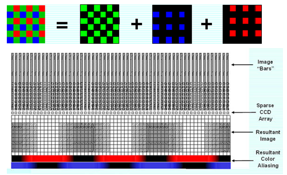 『伪色』的形成除了 摩尔效应之外,感光器的三原色RGB色块排列也要付很大一部分责任。这是因为在颜色取样的同时,因为空间差而没有取样到的颜色,数位相机中的影响处理引擎仍会按照 CCD 色块的顺序排列(RGB),试图为每一个画素去分配应有的颜色。这种情况在大量色块均匀分布时是正确的处理程序。可是遇到突出部或微细构造时,这样的颜色换算往往会出现错误而产生伪色。