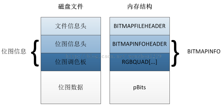 要将位图文件(.bmp)从磁盘读取到内存,首先要了解其文件结构。DIB的文件组成有以下4个部分: