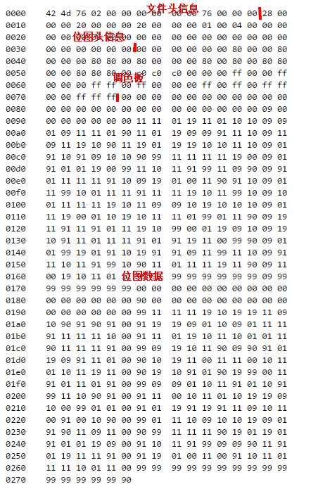 · 首先是文件的头信息 BITMAPFILEINFO 共有14个字节(0x00-0x0D),其起始的两个字节为0x4d42(大端存储,高位在前)表示文件类型为BM,最后4个字节 0x0076是位图的像素信息相对于文件头的偏移量,也就是从0x0076为图像的像素信息。