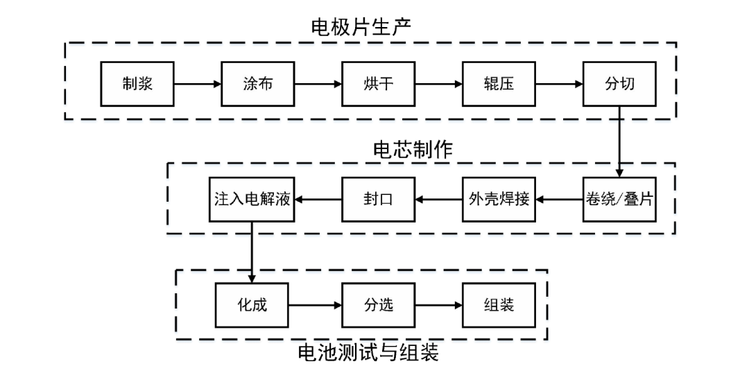 在实际工业生产中,锂离子电池的生产过程主要可分为三大阶段:电极片生产阶段,电芯制作阶段和电池测试与组装阶段,而每一阶段又包含多道工艺步骤。