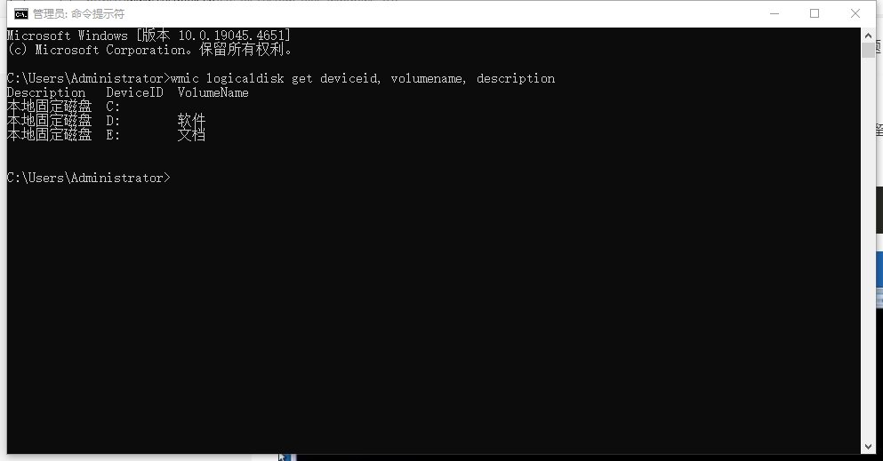 在 Windows 环境外执行 SCF 修复时,必需要告诉它哪个是 Windows 安装盘和系统保留分区,在命令行中执行如下命令可以查看 Windows 系统分区的盘符:输入’wmic logicaldisk get deviceid, volumename, description’