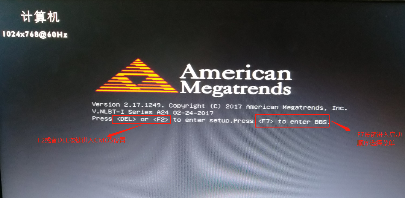 SC5200系列视觉控制器进入CMOS中可以设置从U盘启动,从而方便安装操作系统,我们也可以通过按键“F7”自己设置启动顺序【F7按键为启动顺序菜单选择】。