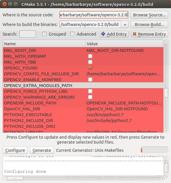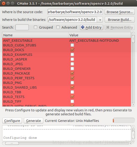 窗口的中间部分即配置列表,这里和使用cmake命令直接生成makefile文件一致的。正如上文所述,这里通过图形界面的方式来进行配置,更加直观方便。
