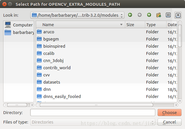 然后选择opencv_contrib-3.2.0文件夹中的modules文件夹,注意,不是只选中opencv_contrib-3.2.0文件夹就好了,需要选中里面的modules文件夹! 如下图所示,然后点Choose。