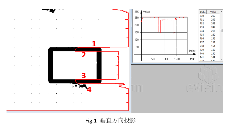 如图1所示,通过垂直投影后,确认了垂直方向上Y的突变点,图中通过垂直投影得到4个位置的突变点,初步确认Y方向的4个位置。