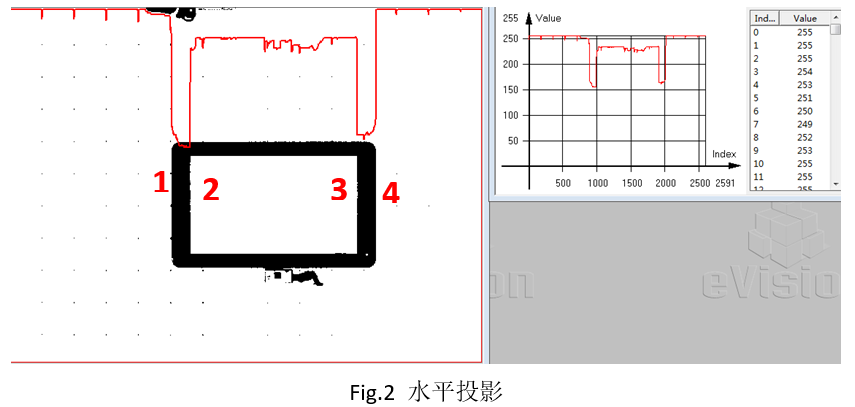 通过水平投影确认水平方向上X的突变点,如图2所示,这样我们就能够确认X方向上的4个位置。
