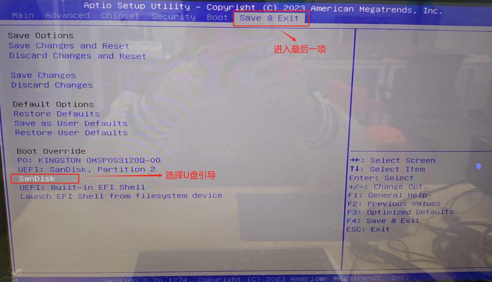 先进入“Save&Exit”,再选择进入U盘引导“SanDisk”,并按键盘上的回车键(Enter)