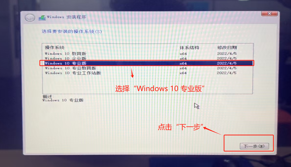 在Windows安装程序中选择“Windows 10 专业版”,点击“下一步”