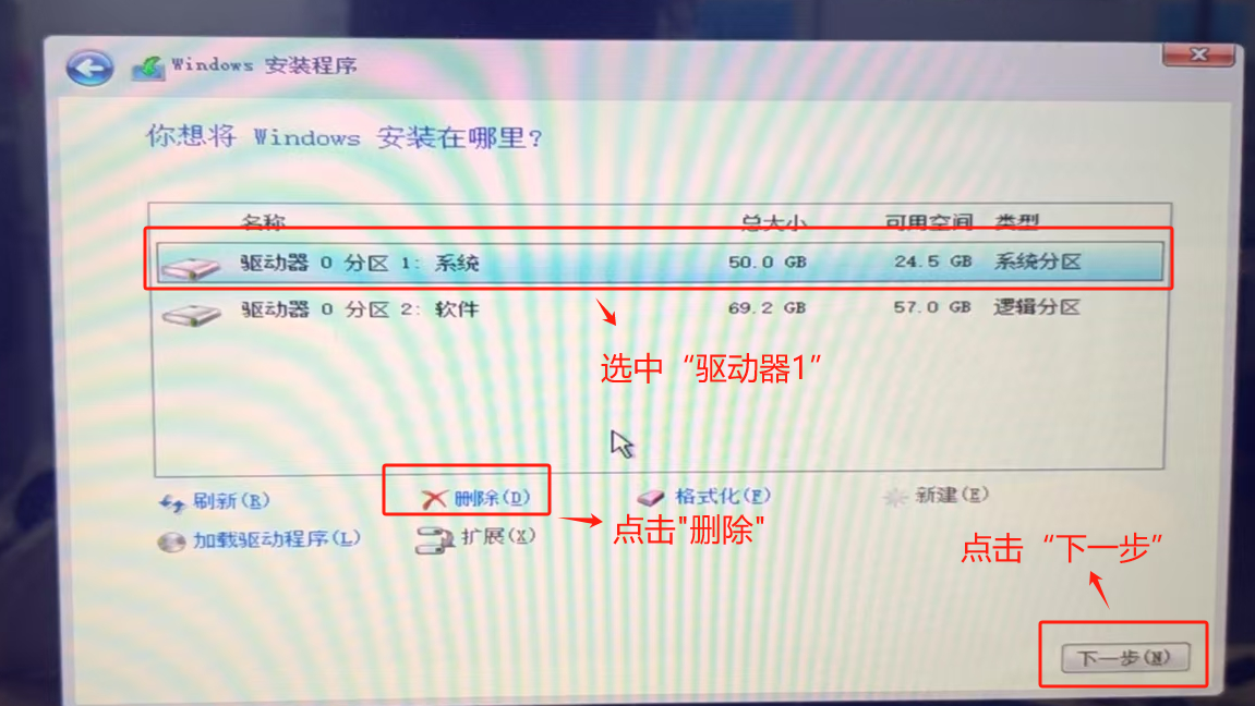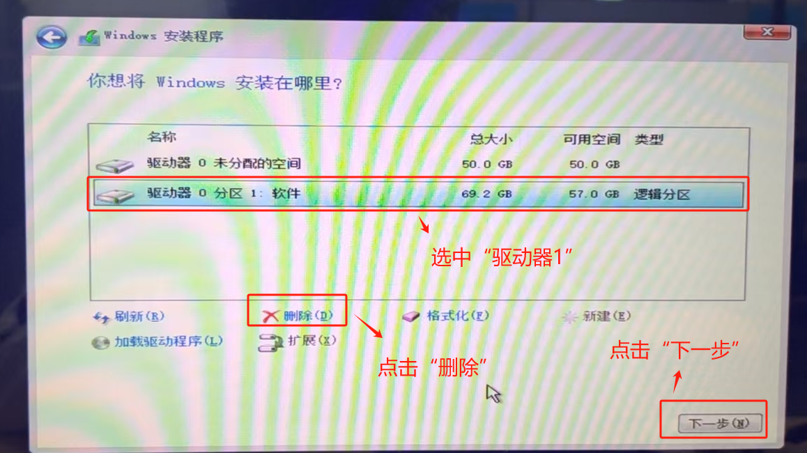 选中“驱动器0分区1:软件”,点击“删除”,点击“下一步”