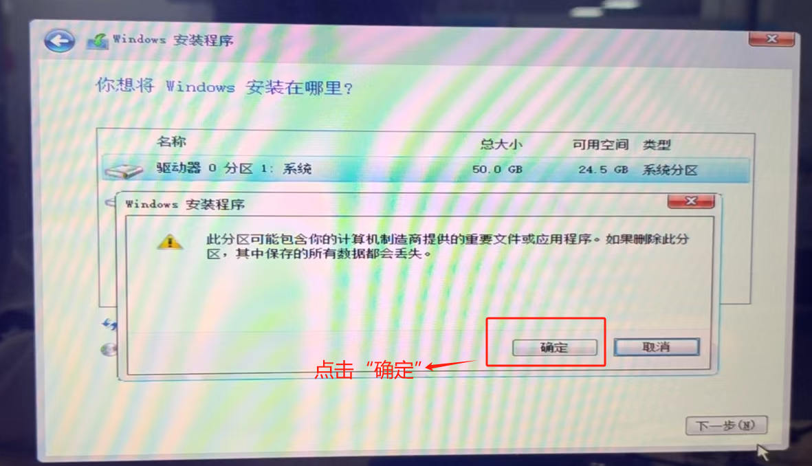 选中“驱动器0分区1:系统”,点击“删除”,点击“下一步”