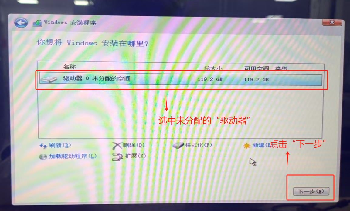 选中“驱动器0未分配的空间”,点击“下一步”