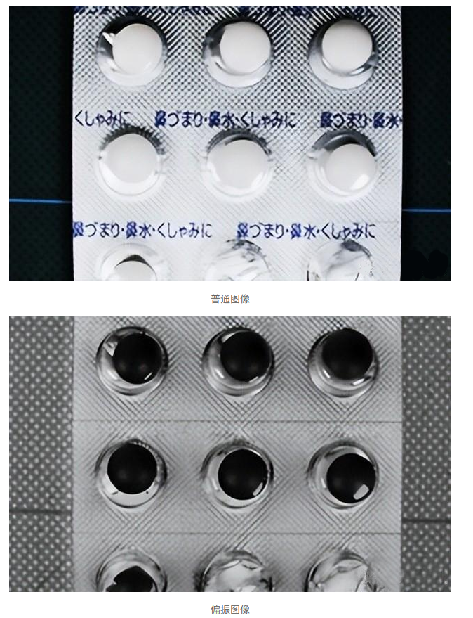 药片泡罩包装的塑料反光常掩盖内部药片,但利用偏振成像增强对比度后,缺失的药片在图像中清晰可辨