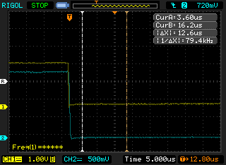 输入信号:IN0 接24V ;COMIn 接地触发 。示波器为通道1(黄色)