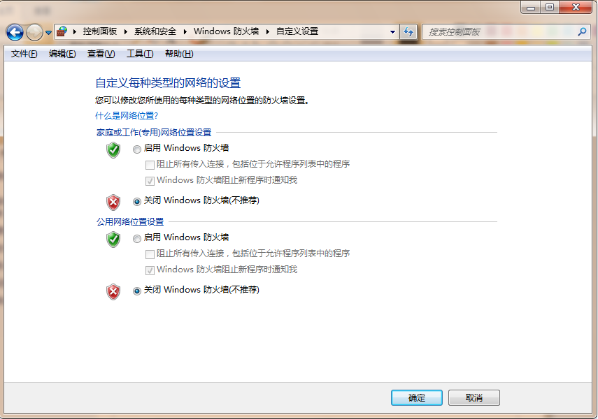 3、选择“关闭Windows防火墙”,然后点击“确定”;