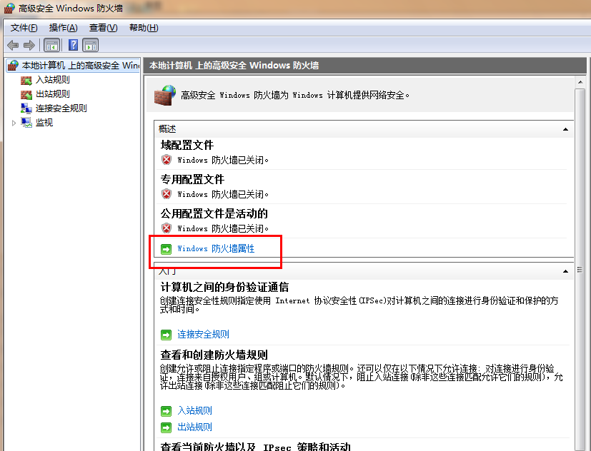 5、点击“Windows防火墙属性”;