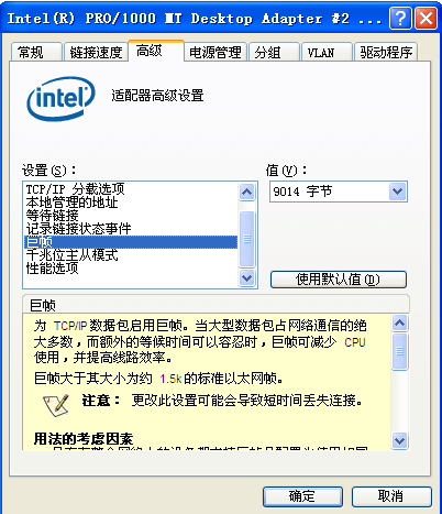 注:不同的intel网卡,最大巨帧值不同,总之,将其设置为最大值