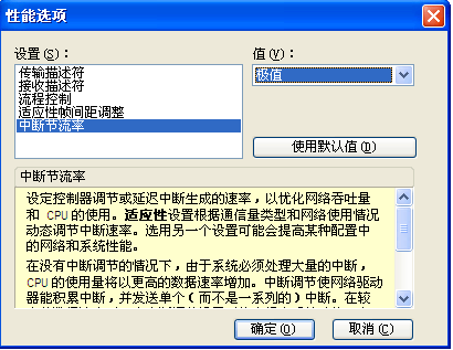 6、在“性能选项”页面,点击“中断节流率”,将值设置为“极值”;