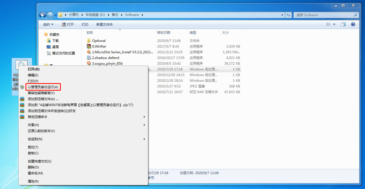 右键单击“4去掉WIN7非法断电界面【放桌面上以管理员身份运行】.bat”文件。