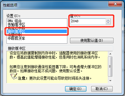 →将“接收缓冲区”的值修改为最大值,图中最大值为“2048”