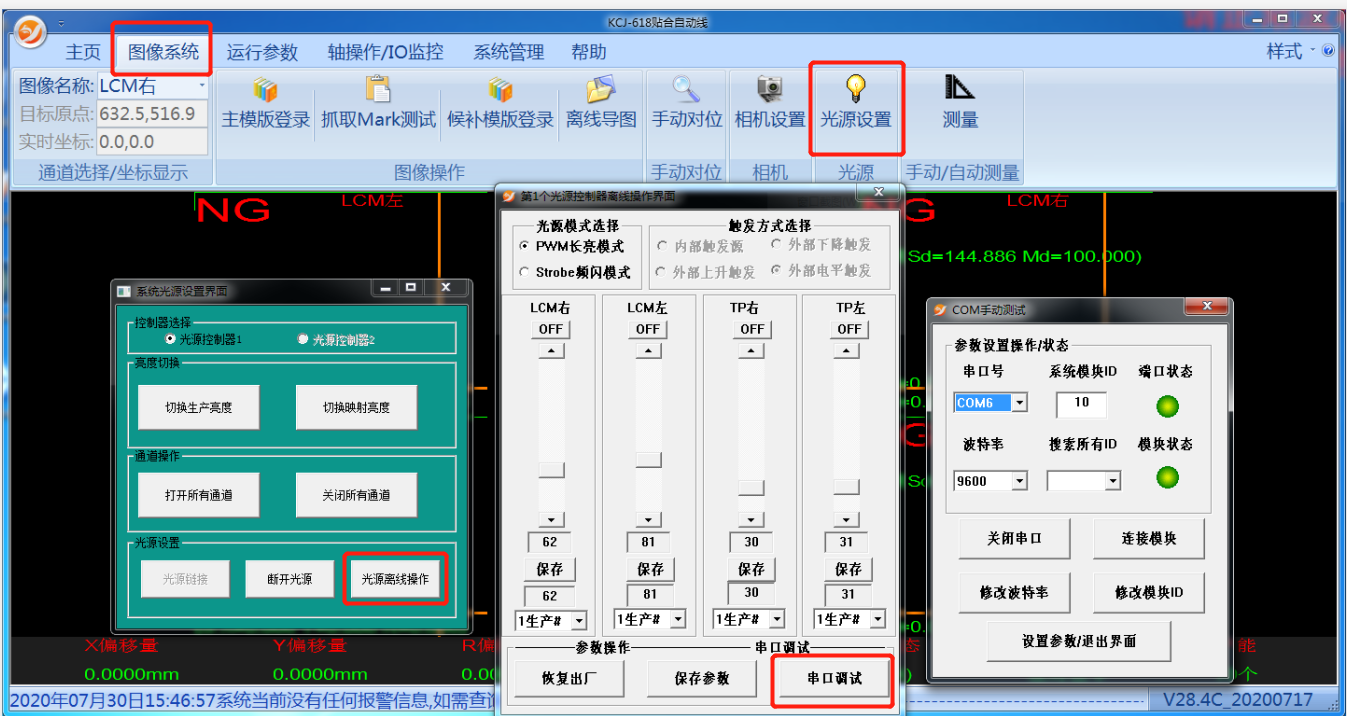 →将光源连接到光源控制器上,点击图中⑧所在区域中的按钮及滑块控制光源开关及亮灭,确认光源控制器无异常,如果异常请找技术确认问题并解决。