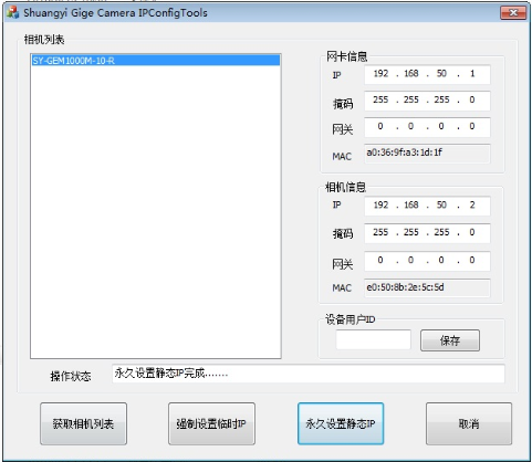 5) 填写相机IP地址(默认192.168.50.2为CCD0,192.168.51.2为CCD1,以此类推),点击强制设置临时IP,系统会显示强制设置临时IP完成……