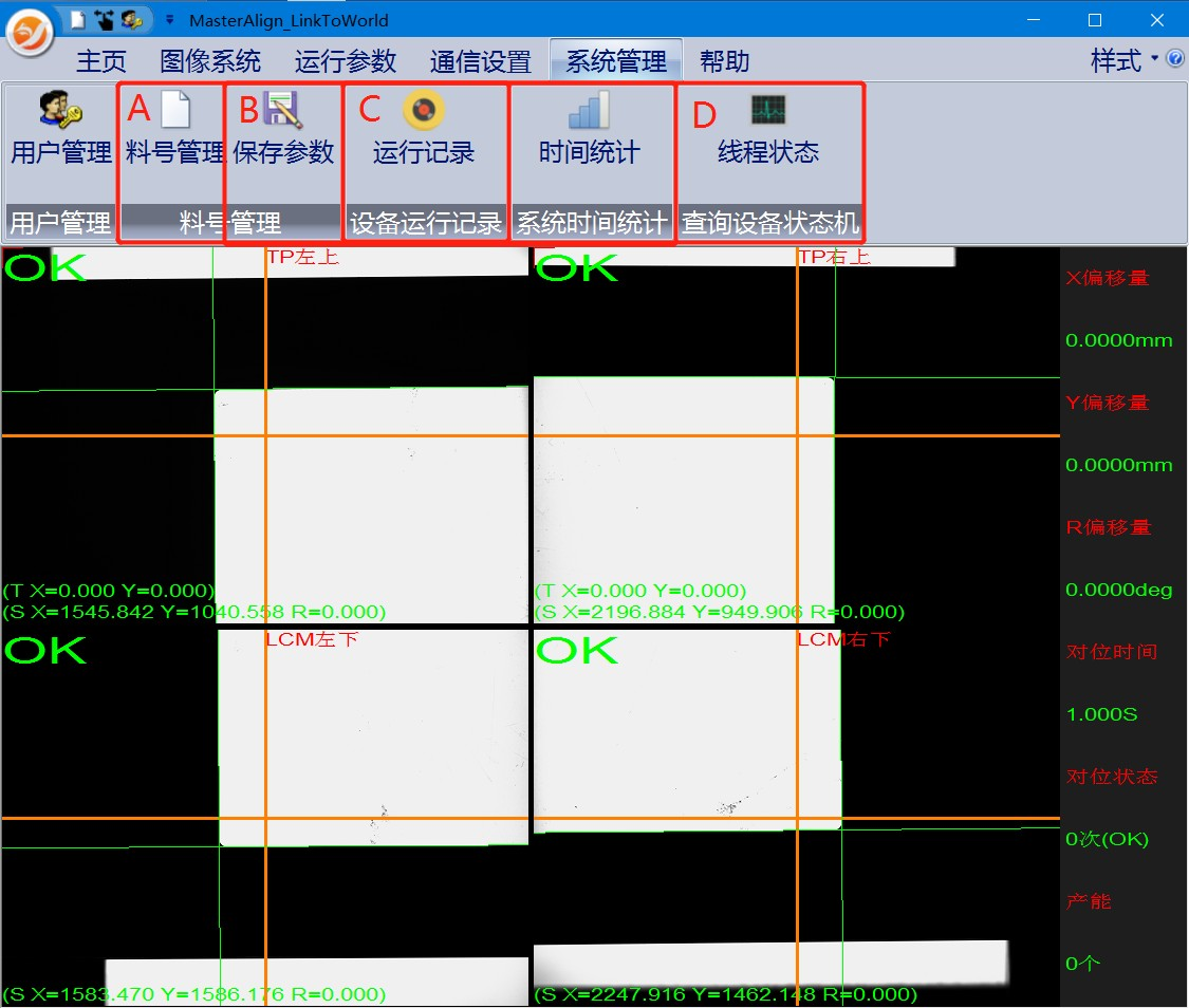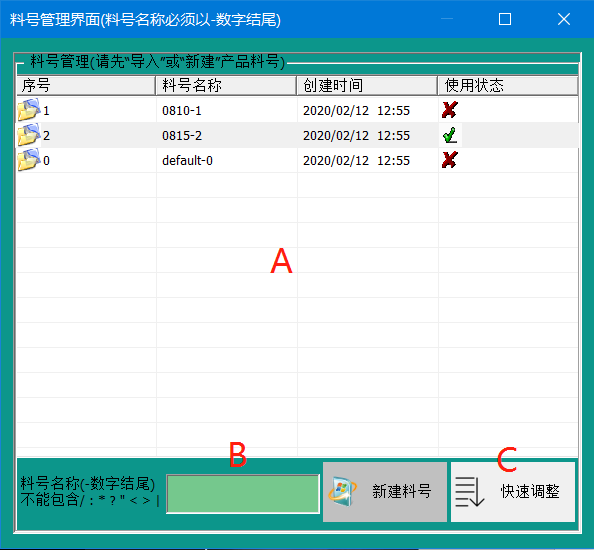 A. 料号管理:操作产品配方相关参数。详情参考第 3.7.1 章“料号管理界面”;