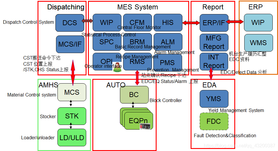 ●MCS: Material Control System, AMHS系统中的核心软件, MES会下达搬送命令给他, 而MCS主要工作便是运用预先定义好的Routing Path, 选择最佳的搬送路径将MES的Marco命令解析为好几个Micro命令在分别下达给如STKC, AGVC, RGVC, HOSC…等各搬送实体的控制器.